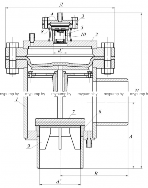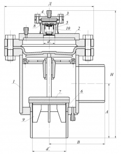 Мембранное сбросное устройство, показанное на рисунке выше, состоит из основного 1 и вспомогательного 3 клапанов с гидравлическими приводами соответственно 2 и 4. Герметичность гидросистемы через клапаны в их закрытом положении, обеспечивается мягкой посадкой на седла 5, 6 золотников 7, 8. Центровка хода золотников обеспечивается направляющими 9, 10. Управление мембранным сбросным устройством сводится к подаче или сбросу давления на гидроприводе вспомогательного клапана. На гидропривод основного клапана подается рабочая вода нерегулируемого давления с тепломагистрали. При наличии давления на гидроприводах мембранное сбросное устройство находится в закрытом положении. При сбросе давления с гидропривода вспомогательного клапана последний открывается давлением снизу на золотник, осуществляя, тем самым, сброс давления с гидропривода основного клапана и его открытие давлением на золотник со стороны тепломагистрали. В зависимости от выбора схемы защиты управляющим элементом мембранного сбросного устройства могут служить как гидравлические, так и электрические средства управления.
