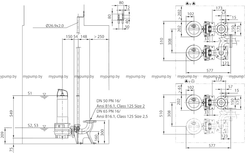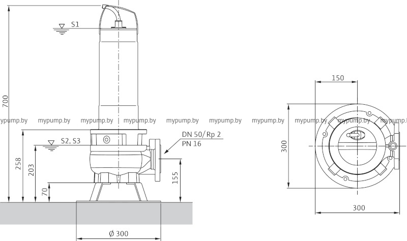 Погружной насос для отвода сточных вод для повторно-кратковременного режима эксплуатации (гидравлика изготовлена из серого чугуна, двигатель — из нержавеющей стали), для стационарной и мобильной установки в погруженном и непогруженном состоянии.
