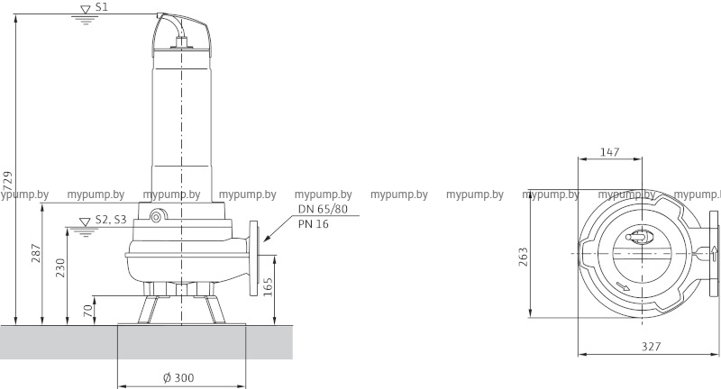 Погружной насос для отвода сточных вод для повторно-кратковременного режима эксплуатации (гидравлика изготовлена из серого чугуна, двигатель — из нержавеющей стали), для стационарной и мобильной установки в погруженном и непогруженном состоянии.