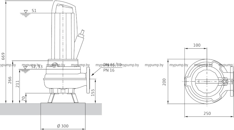 Погружной насос для отвода сточных вод для режима непрерывной эксплуатации, полностью из серого чугуна, для стационарной и мобильной установки в погруженном и непогруженном состоянии.